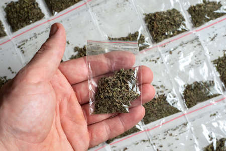 crime evidence: a package with hemp in a person’s hand against the background of many packaged doses of cannabis lie in rows on a light surface