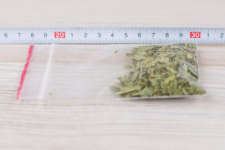 expert analysis of the contents of the package, with material evidence, the suspected presence of drugs, the package of stuff is on the table next to a ruler horizontally