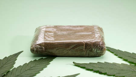 marijuana buds with hash tablet, green leaves, green background
