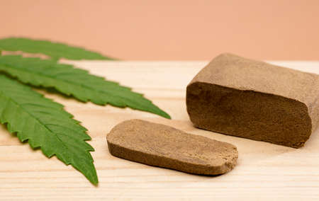 portion hashish with marijuana leaf, brown background