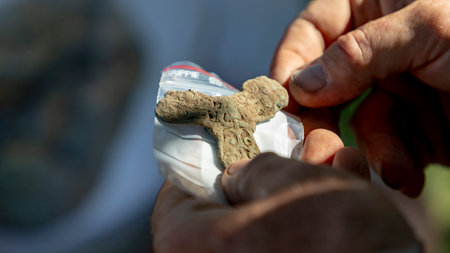 A closeup shot of Viking Age fibula, intact, bronze