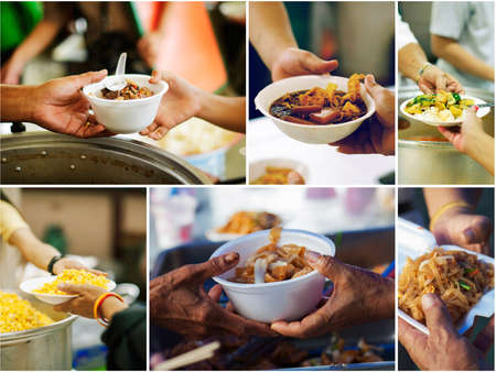 Collage The hands of the poor receive food from volunteers : volunteers giving food to poor people in desperate need
