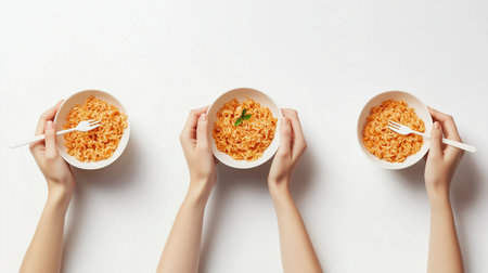 Flat-lay of hands of people eating ,Full depth of field, isolated on white background