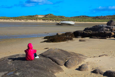Bunberg (Ireland), - July 25, 2016: A girl look a beached wreck in Bunbeg beach, Co. Donegal, Ireland
