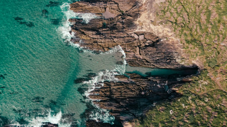 An aerial shot of rocky cliffs near a turquoise seascape