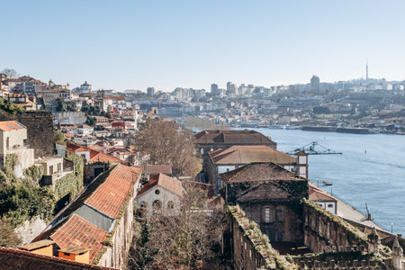 Porto, Portugal - December 28, 2024: View of the Douro River and the picturesque Ribeira district, a UNESCO World Heritage site