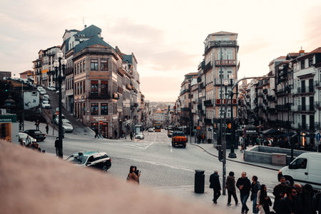 Landscape shot of street intersection at sunset in Porto, Portugal