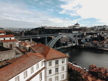 Aerial view of Douro river and Dom Luis I iron bridge early morning in Porto, Portugal.
