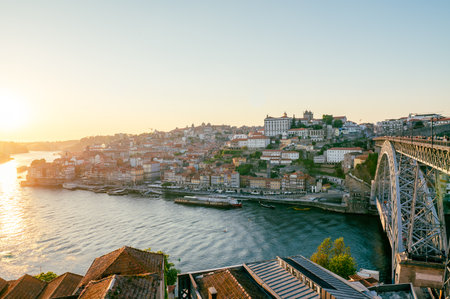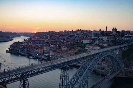 Cityscape of porto Portugal from Ponte de dom luis bridge at sunset. Douro river crossing the city