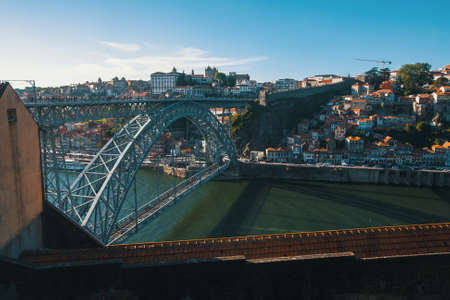 View of Dom Luis I bridge, Douro river and Ribeira, Porto, Portugal.