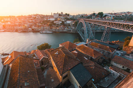 Bird's-eye view of Douro river and Dom Luis I bridge at sunset, Porto, Portugal.