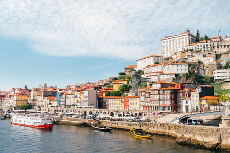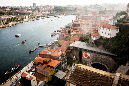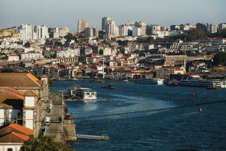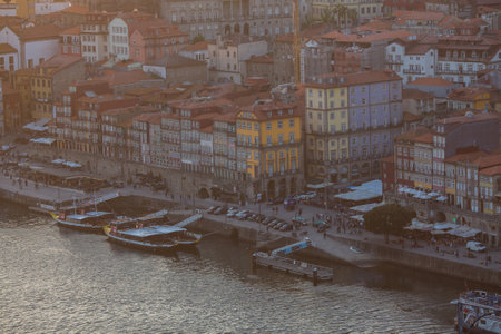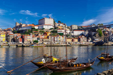 Stunning view of Porto city and the Douro River with traditional boats carrying port wine barrels from the Marginal de Gaia riverfront