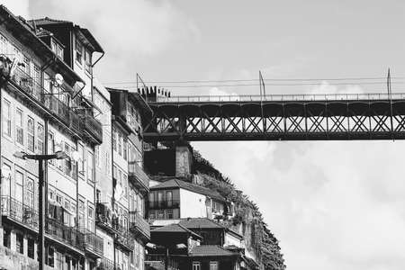Bridge Built by Eiffel on the Bacground of the historical centre of the city of Porto with traditional Portuguese facades sometimes decorated with ceramic tiles of azulejo. Black and white photo