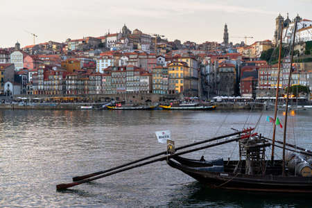 View of Porto city at the riverbank (Ribeira quarter) and wine boats(Rabelo) on River Douro(Portugal), a UNESCO World Heritage City.