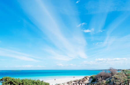 Tourists enjoying summer vacations sunbathing and swimming in the turquoise clear water of Punta Molentis beach, Villasimius, Sardinia, Italy