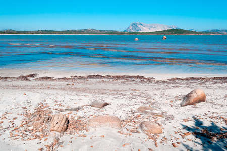 Beach view of coastal Sardinia with view of Isola Tavolara