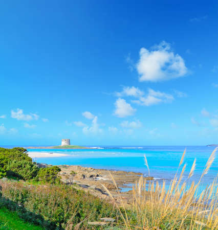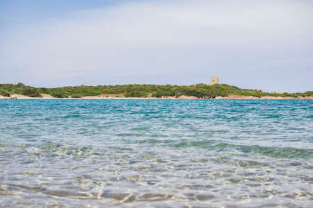 Ancient watchtower on small Island close to La Pelosa in Stintino on Sardinia island in Italy