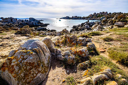 Large granite boulders and abandoned fisherman's village on the coast of Cavallo Island n the Lavezzi archipelago of Corsica