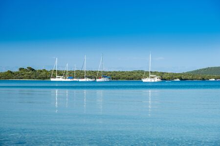 Beautiful seascape on Adriatic sea in Croatia, Dugi otok island, sailing boat on seashore in bay on Veli Rat