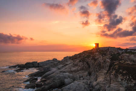 Sunrise over the silhouetted Genoese tower at Punta Spano near Lumio and the rocky coastline of the Balagne region of Corsica with Cap Corse in the distance and Sea Figs in the foreground