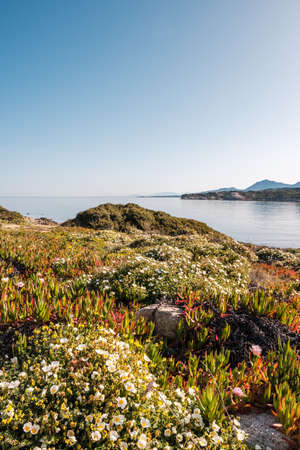 Wild flowers in bloom in the maquis on the coast of La Revellata in the Balagne region of Corsica