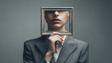 A person holds a picture frame before their face, symbolizing reframing thoughts and boosting self-awareness through reflection.