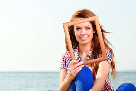 Portrait of a girl with a frame on a background of blue sky