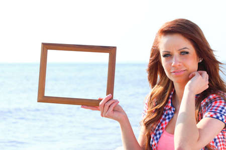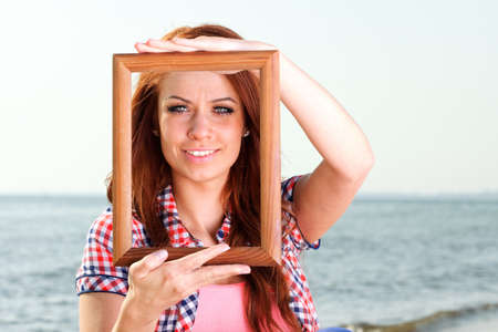 Woman sea sky vacation Holding Frame travel concept