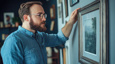 A man with glasses adjusting a metal photo frame on a wall, emphasizing interior design and personal style