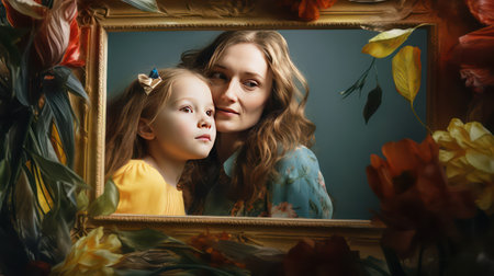 Portrait of a mother and daughter in a photo frame with flowers