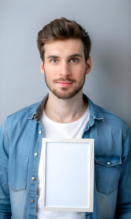 A young man in a denim shirt holds a blank white frame in front of him. Perfect for displaying your profile picture. logo. or branding.