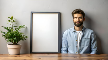 Modern mockup featuring a man in a casual denim shirt sitting in front of a blank framed poster on a wooden table. Perfect for showcasing product designs. branding. or social media promotions.