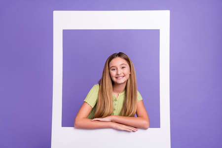 Portrait of adorable friendly pupil toothy smile look through paper album card isolated on purple color background