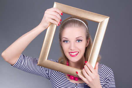 young attractive blondie pinup girl in striped dress with photo frame over grey