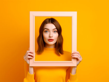 portrait of woman with empty picture art frame isolated on yellow background