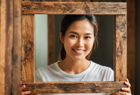A smiling woman holds a wooden picture frame. Shes indoors, demonstrating a frame around her face.