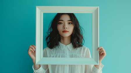 Portrait of beautiful young asian woman looking through the white frame on blue background.