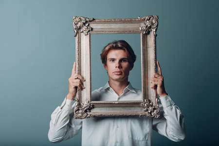 Millenial young man artist with blonde hair on gilded picture frame portrait. Isolated on blue background in studio.