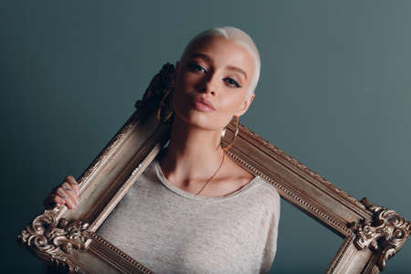 Young adult woman face beauty portrait with short blonde hair hold on gilded picture frame