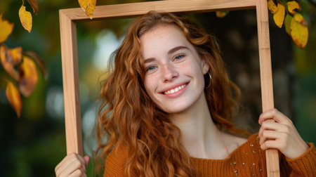 A joyful young woman with curly red hair poses within a wooden frame, surrounded by vibrant autumn leaves, showcasing beauty and happiness in nature.