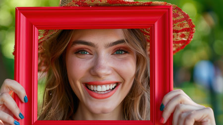 A happy young woman is joyfully smiling while holding a bright red frame in a lush green outdoor setting, radiating positive energy and warmth.