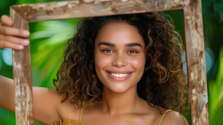 A vibrant portrait of a young woman with curly hair happily holding a wooden frame. Surrounded by lush green foliage, she radiates joy and charm, embodying a serene and carefree lifestyle in nature.