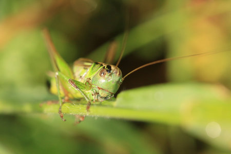 Green grasshopper sitting on leaf. Small Tettigonia viridissima with long antennae sit in grass, side view. Nymph of great green bush-cricket, soft selective focus