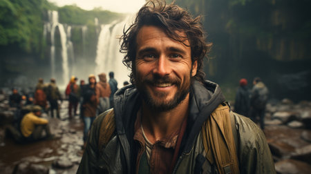Tourist taking selfie picture in front of waterfall.