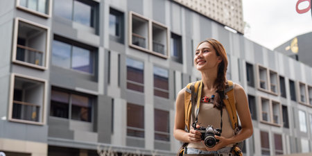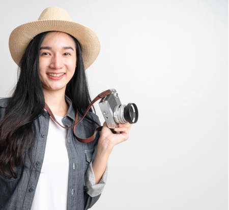 Beautiful asian thai woman traveler taking photo with vintage camera outdoors.