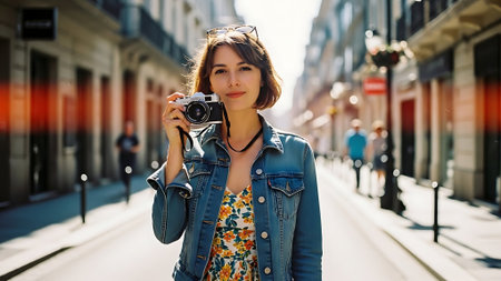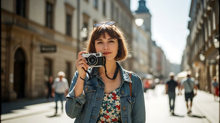 A young woman taking a photo with a camera on a city street
