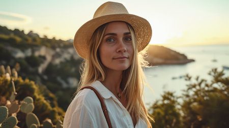 Smiling young woman with backpack and camera against beautiful landscape with coastal mountains and sea at sunset. Female traveler during outdoor adventure