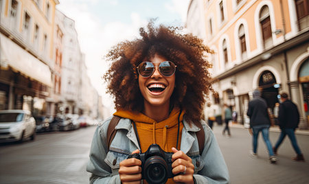 Cheerful African American tourist captures moments, her infectious smile lighting up the scene. AI generative.