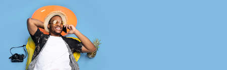 Black guy in trendy summer clothes laying on inflatable lilo