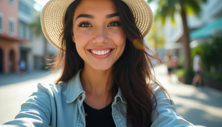 A young woman with long, flowing hair and a wide-brimmed hat beams joyfully at the camera, capturing a moment of happiness. The vibrant street scene behind her, filled with palm trees and soft sunlight, enhances the cheerful atmosphere of this delightful portrait.